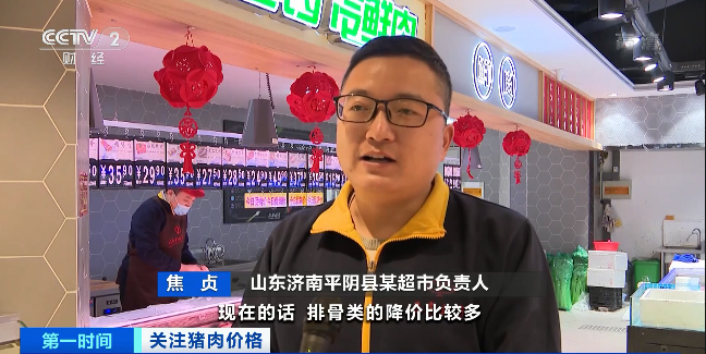 山东济南平阴县某超市负责人 焦贞:现在,排骨类的降价比较多,普通的降幅在四五元左右,精肋的降幅更大一点。
