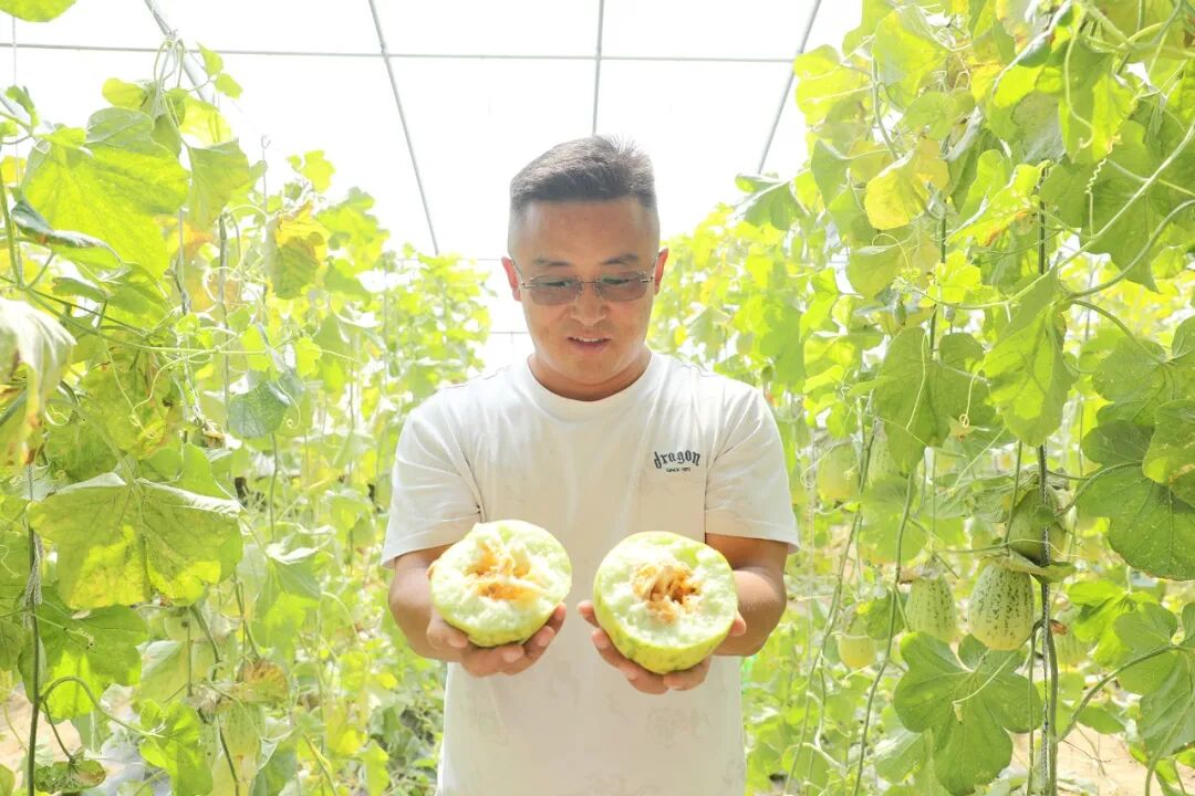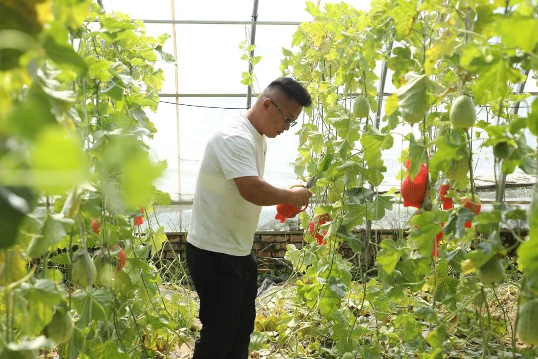 野目盖村不光有特色养殖业,更有设施蔬菜,让村民们在家门口实现增收。村内一座座标准化大棚整齐排列,从空中俯瞰蔚为壮观。走进野目盖村党支部副书记苏林平的大棚内,阵阵瓜香清甜诱人,甜瓜迎来丰收。苏林平忙着给甜瓜套网,动作娴熟而利落,网套将甜瓜包裹严实,既保护了甜瓜免受碰撞损伤,又为它们增添了一份精致。苏林平作为村干部,不仅发展了自己的产业,更带动其他村民增收致富。