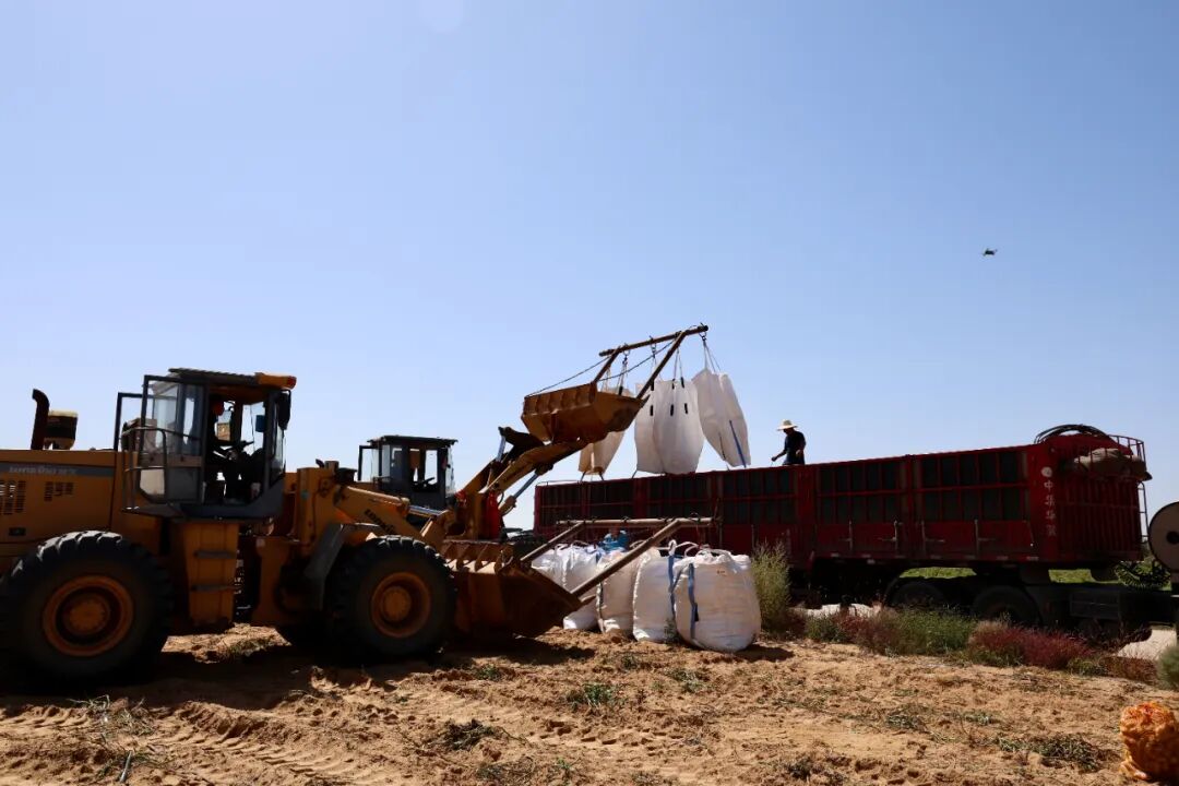 不远处的田间,工人们则忙着进行辅助作业:大家三人一组、五人一群,有的俯身弯腰,捡拾田中的马铃薯块;有的提袋捡拾,快速将分拣整齐的土豆装袋、搬运上车,每个人脸上都洋溢着丰收的喜悦。