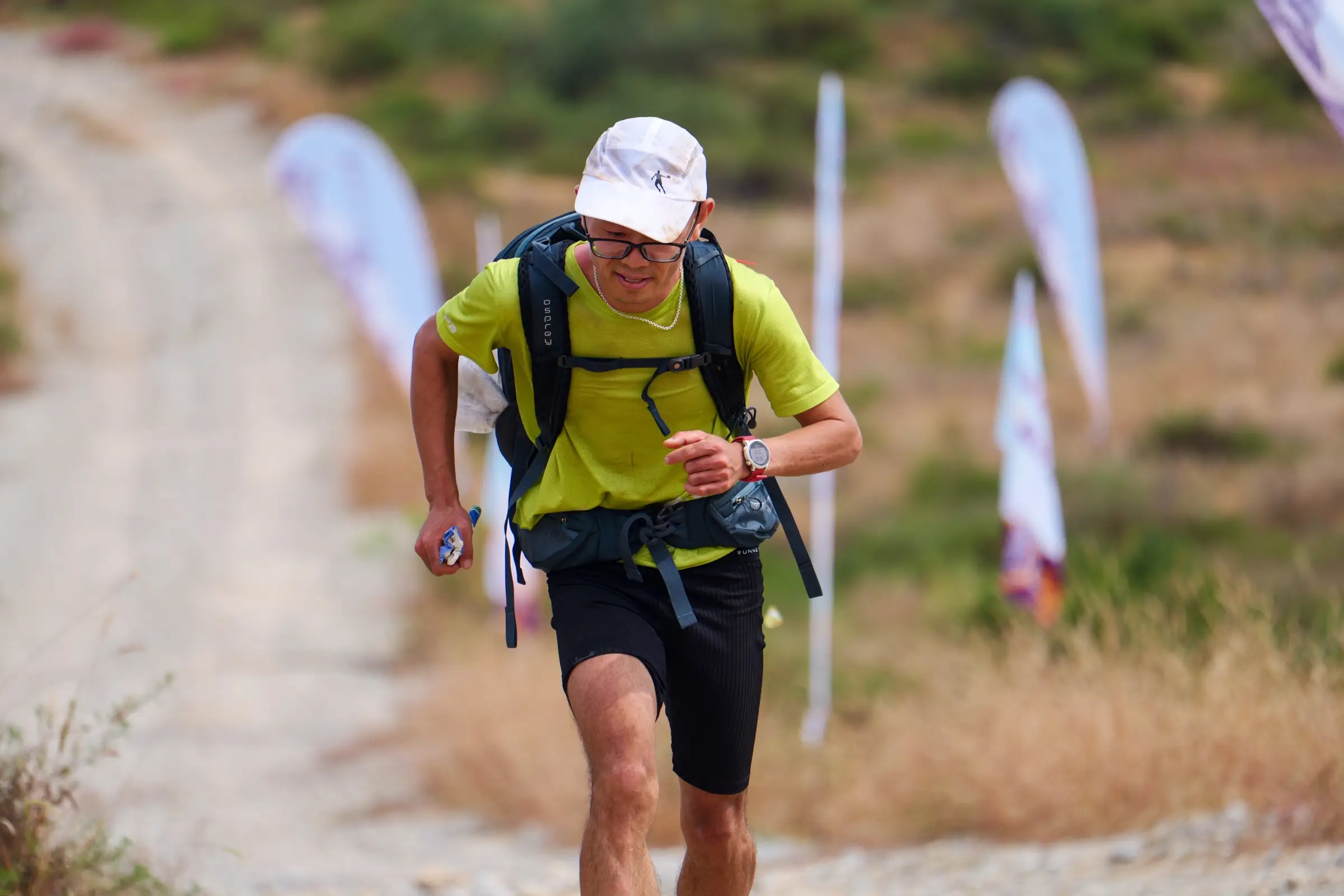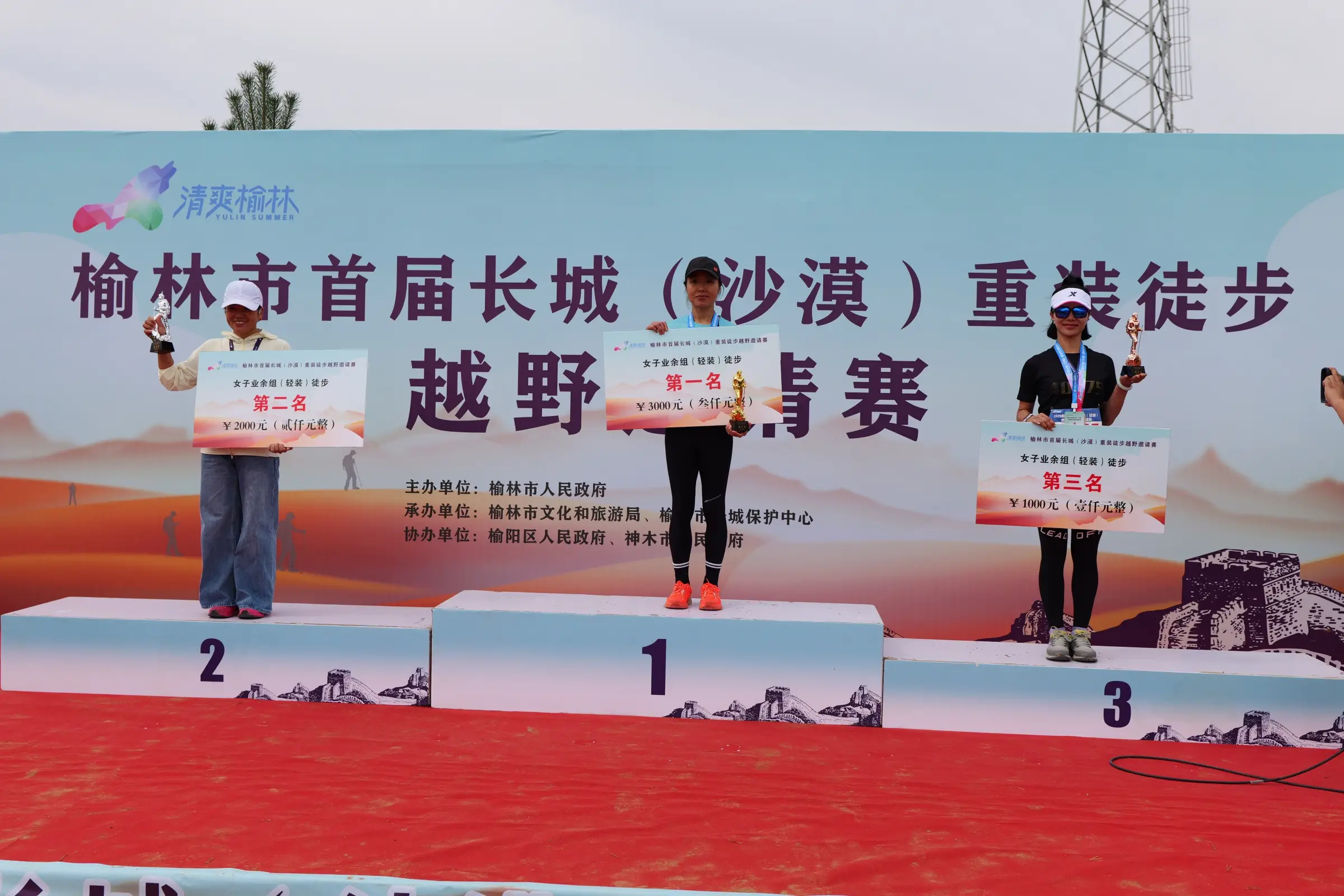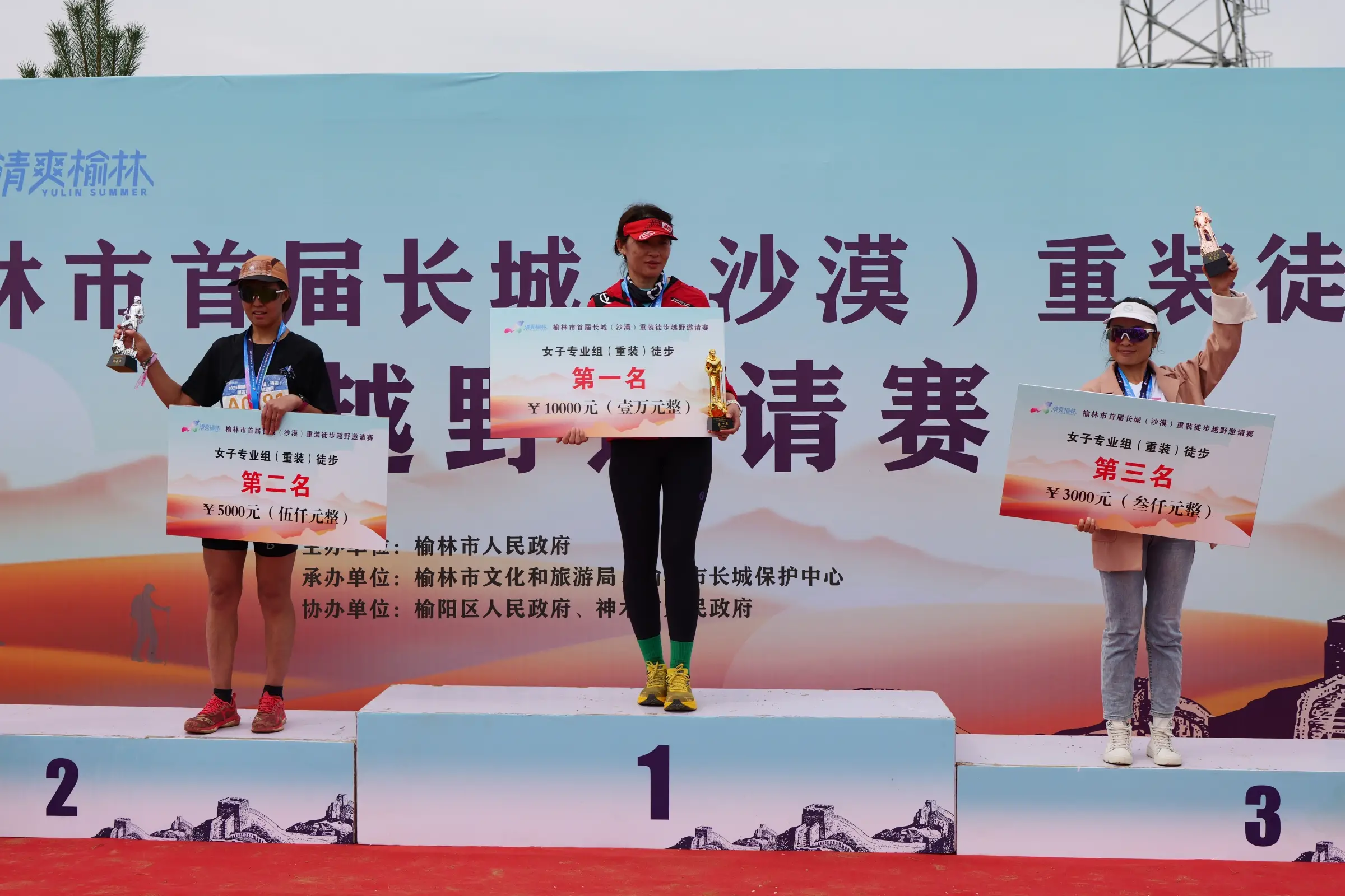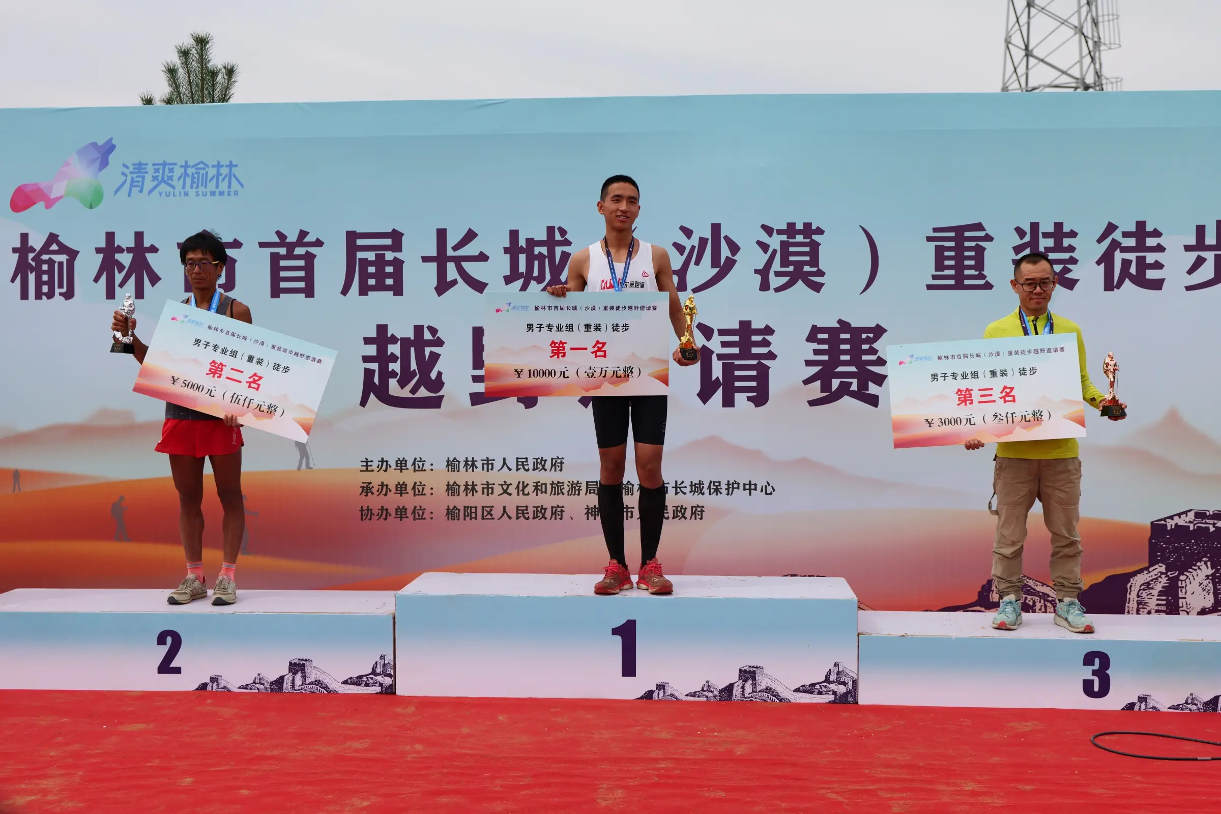 经过数小时激烈比拼,赛事于中午圆满结束。在颁奖仪式上,轻装组与重装组的男子、女子冠、亚、季军选手依次上台领奖。重装组冠军周航以1小时18分的成绩拔得头筹,他在赛后兴奋地表示:“从未体验过这样的赛道,沿途就是古老的烽火台,虽然沙地负重极具挑战,但也被周边的绿植和风景深深吸引。”现场嘉宾为获奖选手颁发了奖牌和证书,观众以热烈掌声向所有完赛者表达祝贺与敬意。