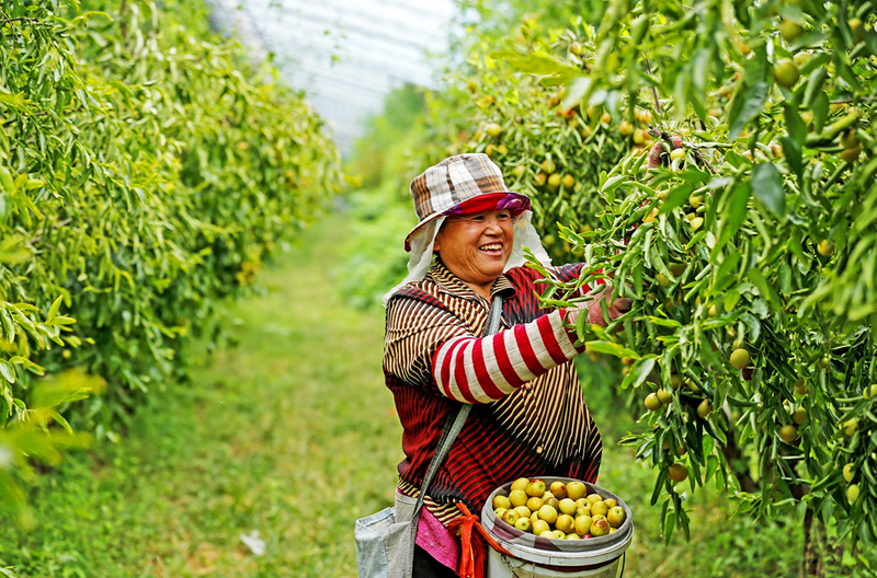 9月10日,在山西省襄汾县邓庄镇席村冬枣种植基地内,种植户正在采收冬枣。
