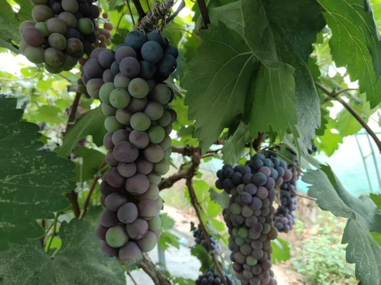 走进西沙街道盘龙湾葡萄园,连片棚架下,一串串饱满的葡萄缀满枝头,阳光穿透翠绿叶片,洒在紫红色的果实上,晶莹剔透的果粒愈发诱人,浓郁果香在空气中悄然弥漫。农户白瑞兵穿梭在藤架间,仔细打理着葡萄藤的杂叶,谈及自家葡萄,他如数家珍:“我们主要种夏黑和户太八号,8月到10月都是采摘期,今年长势不错,预计一个棚能收入三四千元。”