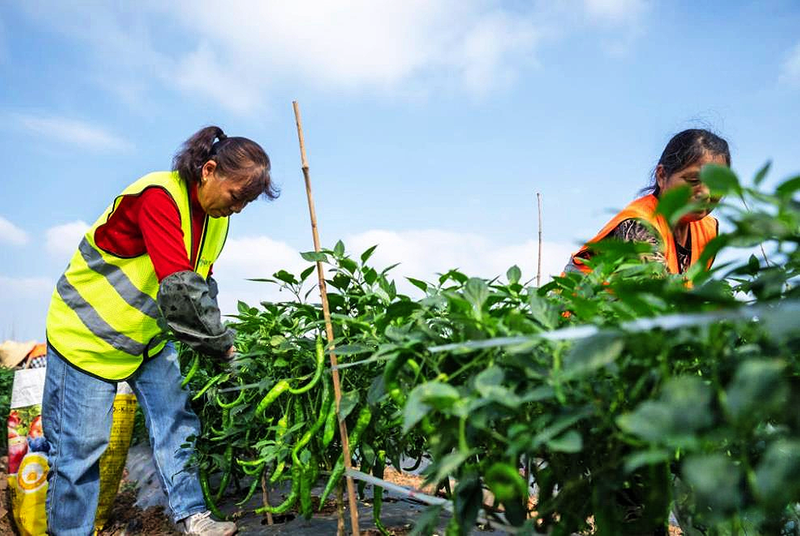 10月14日,在湖南省南县华阁镇新安村,村民在采摘辣椒。