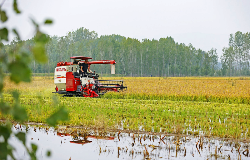 10月16日,山西省临汾市襄汾县襄陵镇屯李村,农民驾驶稻谷收割机在田间作业,忙着收割水稻。