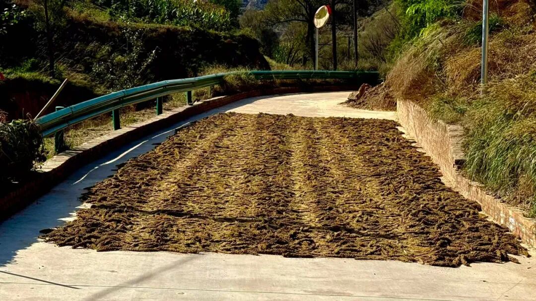 晌午时分,村里的水泥路就成了天然的“晒场”与“打谷场”。农户们纷纷把地里收来的糜谷穗均匀铺在路面上,过往的一辆辆轿车、摩托车缓缓驶过,车轮碾过谷穗,噼啪作响间,饱满的糜子从壳中脱落——这是黄土高原上代代相传的脱粒智慧。