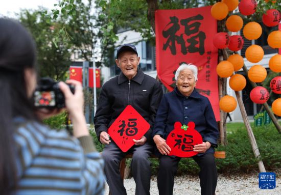 10月21日,青年志愿者给金婚老人拍合影。