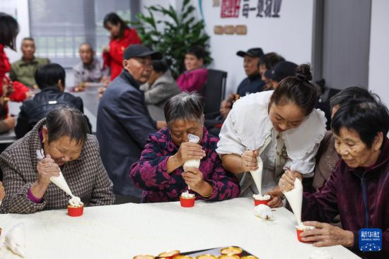 10月21日,志愿者在教老人制作纸杯蛋糕。