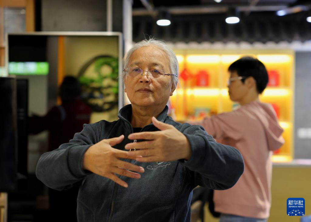 10月11日,全国职工健康促进工程办公室等单位在北京组织八段锦教学公益活动,西城区居民在长安商场的健康驿站学习八段锦。