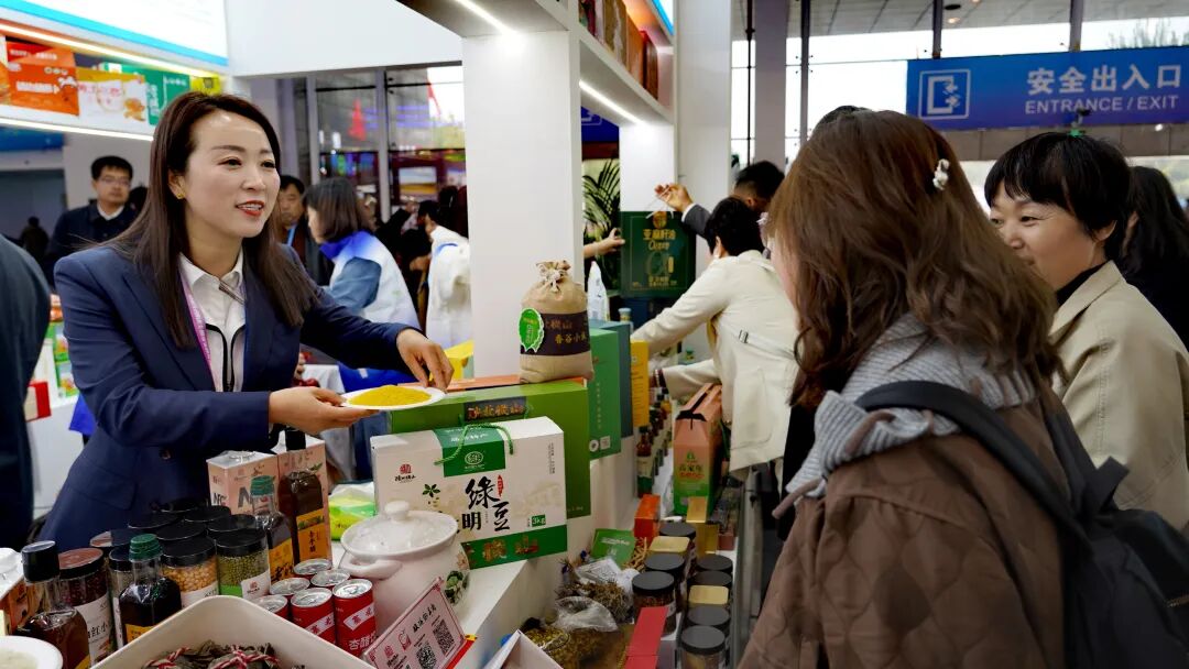 榆林市天顺昌商贸有限公司高永琴向参展客商介绍横山优质小米