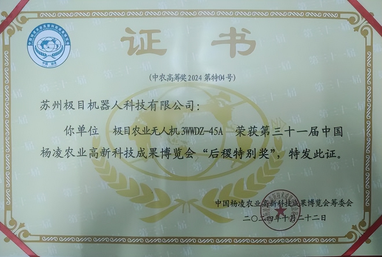 作为第31届杨凌农高会上主推机型,苏州极目机器人科技有限公司参展的极目J100在农高会期间获得多项行业认可,也斩获多项大奖。在夺得“后稷特别奖”,成为农业无人机领域首款获此殊荣的杰出机型的同时,还荣膺首届睿抗(杨凌)全球农业机器人应用赛“产业之星”以及“巅峰创新奖”荣誉称号,成为农高会上的热门话题。