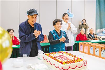 10月10日,鄂尔多斯市康巴什区青春山街道神华康城社区举行“我们的节日·福满金秋 相约重阳节”活动。该社区的工作人员和老人们欢聚一堂,为过生日的老人举行“长者生日宴”,大家围坐在一起品尝蛋糕,其乐融融。记者 王晓博 摄
