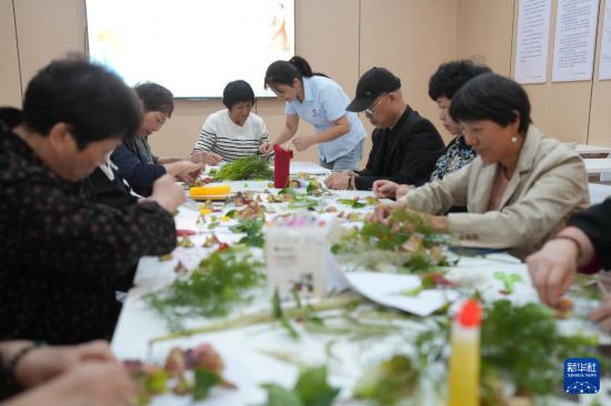 10月10日,老人们在社区邻里中心学做重阳主题的花饰。