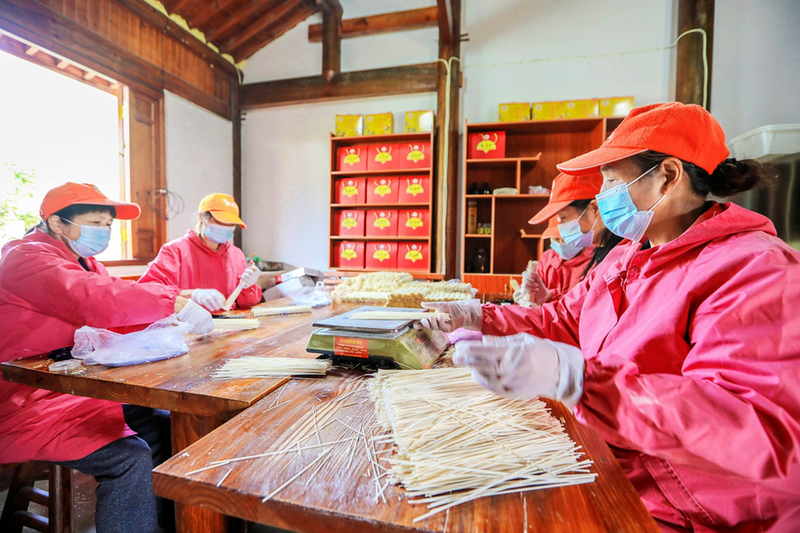 图为近日,大岕口村村民正在对银杏面进行分拣、包装,为产品上市流通作准备。