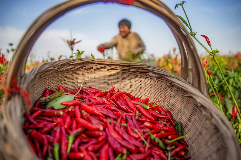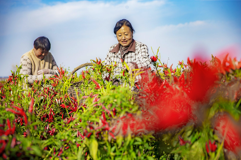 11月11日,河南省宁陵县黄岗镇商会明集果蔬种植专业合作社的辣椒田里,社员们忙着采摘、分拣红彤彤的小红椒,一派丰收忙碌的景象。
