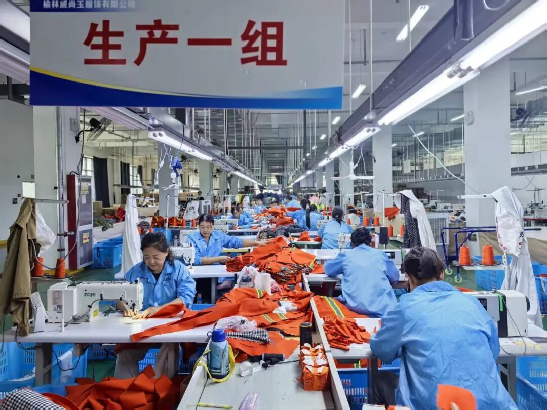走进生产车间,机器运转声此起彼伏,工人们手脚麻利地完成裁剪、缝制、质检等工序,一派繁忙有序的生产景象。据榆林威尚玉服饰有限公司总经理贺三娃介绍,目前项目订单储备充足,已顺利承接近20万件服装生产任务,远销英国、波兰等海外市场,在国际市场打响“绥德制造”的名气。