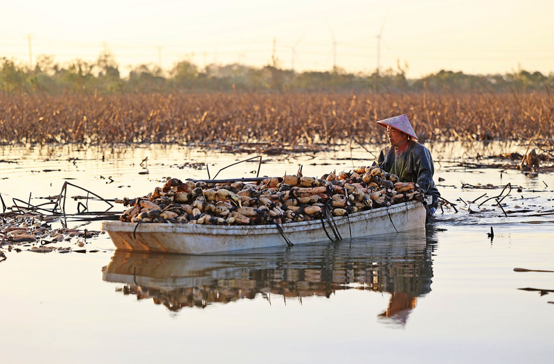 11月24日,在安徽省宿松县省属农垦华阳河农场的莲藕种植基地,藕农正忙着采挖冬藕,保障市场供应。