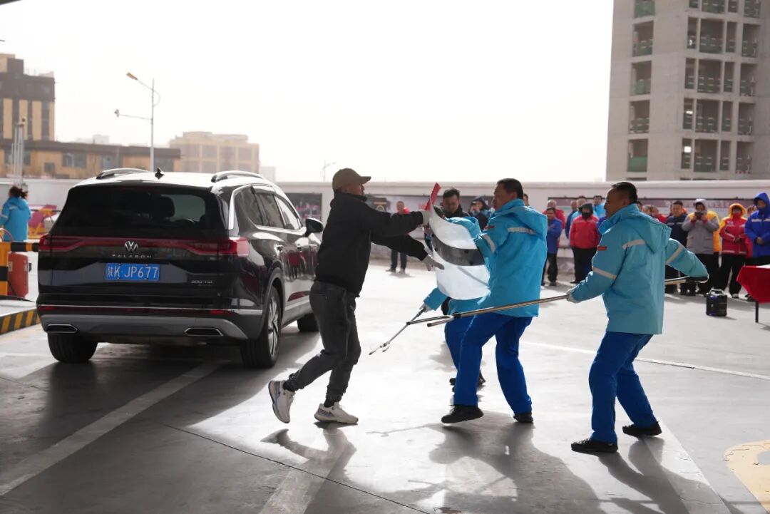 随后,与会人员观摩了实战模拟演练。演练模拟大风天气下加油站罩棚着火场景,工作人员迅速启动应急预案,完成警戒隔离、灭火扑救、人员疏散全流程操作。另外设“刀斧砍杀加油员”模拟环节,全体员工联动实施控制、报警、周旋,展现高效应急处置能力。演练过程贴近实战,获现场一致认可。