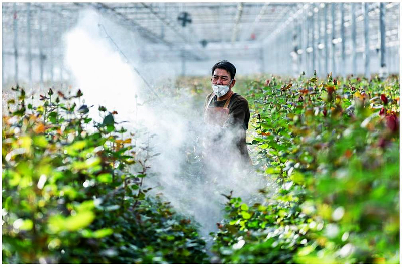 11月25日,在位于宁夏银川市兴庆区大新镇的农业高科技智慧示范园内,工人为花卉浇水。