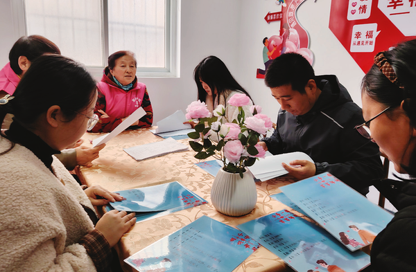 在陈仓区东街社区红娘牵囍工作室,红娘和志愿者一起查看登记青年的信息。