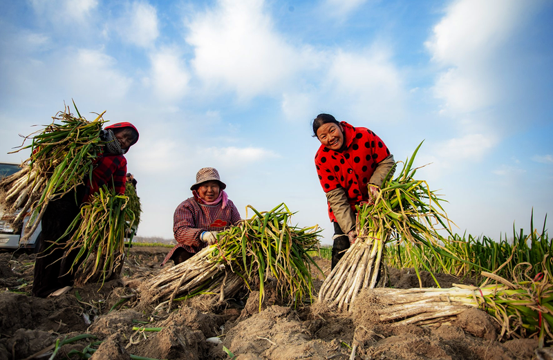 12月2日,河南省商丘市宁陵县孔集乡吴园村的大葱迎来丰收季,村民们忙着采收、装运,保障市场供应。