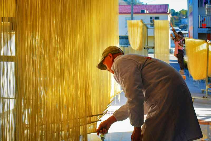 12月3日,在安徽省安庆市岳西县莲云乡珠屋村,村民正忙着制作手工挂面。
