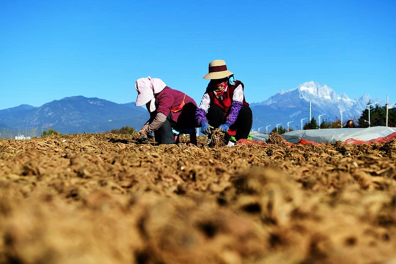 12月7日,农民在云南省丽江市玉龙县黄山街道的一处空地分拣、晾晒中药材当归。