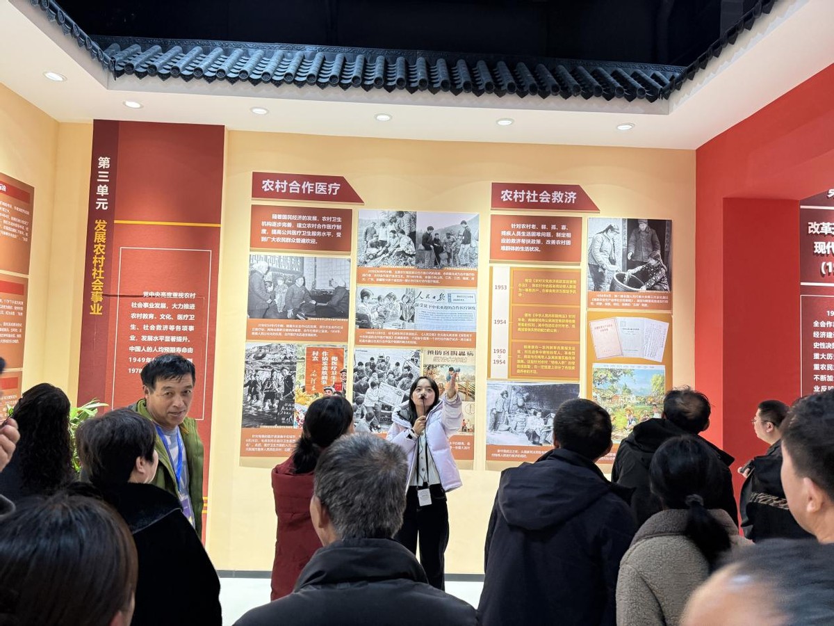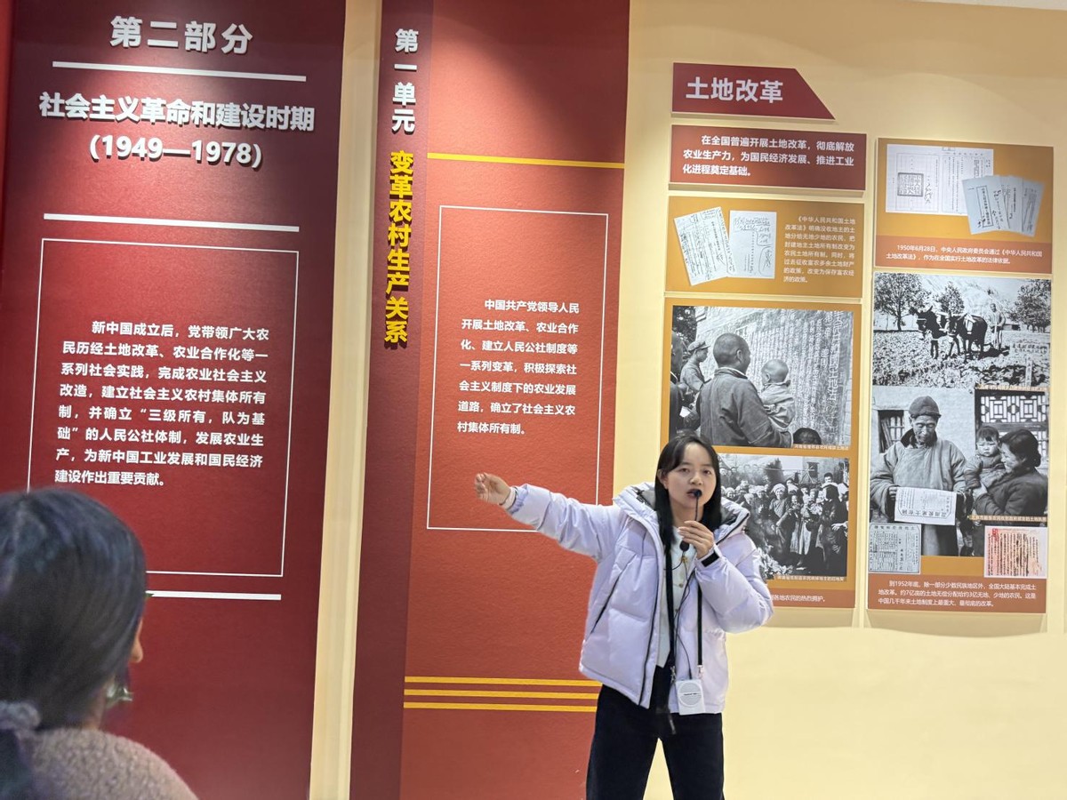 百年伟业·红色三农研学馆内,陕西农林职业技术大学老师客串的解说员,结合展品讲解红色三农故事。来自陕西咸阳的学员张容驻足“百年伟业 三农华章”大字前,眼眶湿润:“党领导下‘三农’成就巨大,我无比自豪。”她坦言此前对乡村治理认知模糊,如今深受启发:“回去把所学落地,带头发展产业、参与治理。”话语引发共鸣,学员们纷纷表示要将红色精神转化为干事动力。