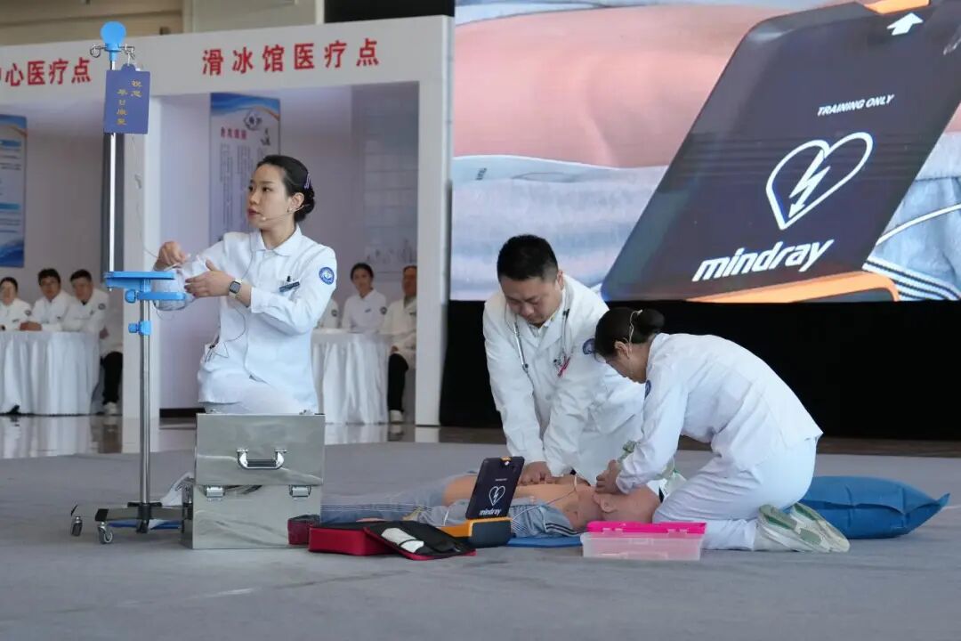 演练现场紧张有序、环环相扣、贴近实际。在失温现场应急处置演练中,医护人员快速完成患者转运、保暖升温、生命体征监测等流程,成功稳定重度失温患者病情;在切割伤处置演练中,通过加压包扎、止血带应用等规范操作,有效控制运动员冰刀划伤后的出血现象;骨折应急处置中,医护团队精准实施颈托固定、支具外固定及协同转运,最大限度保护受伤运动员;心肺复苏全流程演练完整呈现了从现场评估、AED除颤到医院绿色通道衔接、多学科救治的全链条处置,成功实现患者复苏,全面展现了各医疗团队过硬的专业素养和高效的协作能力。