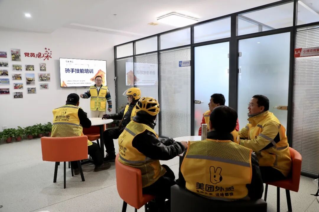 “骑手港湾”流动党员服务站工作人员正为外卖骑手进行技能培训