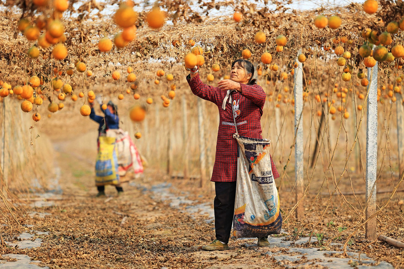 12月28日,安徽省宿松县省属农垦华阳河农场瓜蒌种植基地,种植户忙着采摘成熟的瓜蒌。