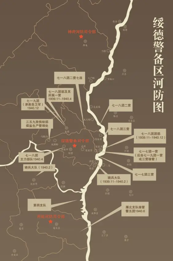 (三)抗日民族统一战线与敌后抗战的中流砥柱。全民族抗日战争爆发后,绥德成为陕甘宁边区坚强的“北大门”。1939年8月,八路军第359旅奉命进驻绥德,接防绥德警备区河防任务。1938年初至1939年底,边区河防部队英勇抗击日军的疯狂进攻,与敌进行大小河防战斗48次,其中较大战斗7次,粉碎了日军西渡黄河进犯的野心。绥德党组织动员3万青年参军,组织“担架队”“运输队”支援前线,创办“抗战剧团”,并于1939年7月支持设立陕北公学绥德分校(后于1941年并入延安大学,成为延安大学绥德分校前身),为抗日前线输送了大量的干部和兵员,成为敌后抗战的“坚强堡垒”。1942年5月,彭德怀同志在视察绥德警备区时指出:“陕北人民是革命的靠山,小米和热血是革命的给养,绥德更是西北的屏障。”
