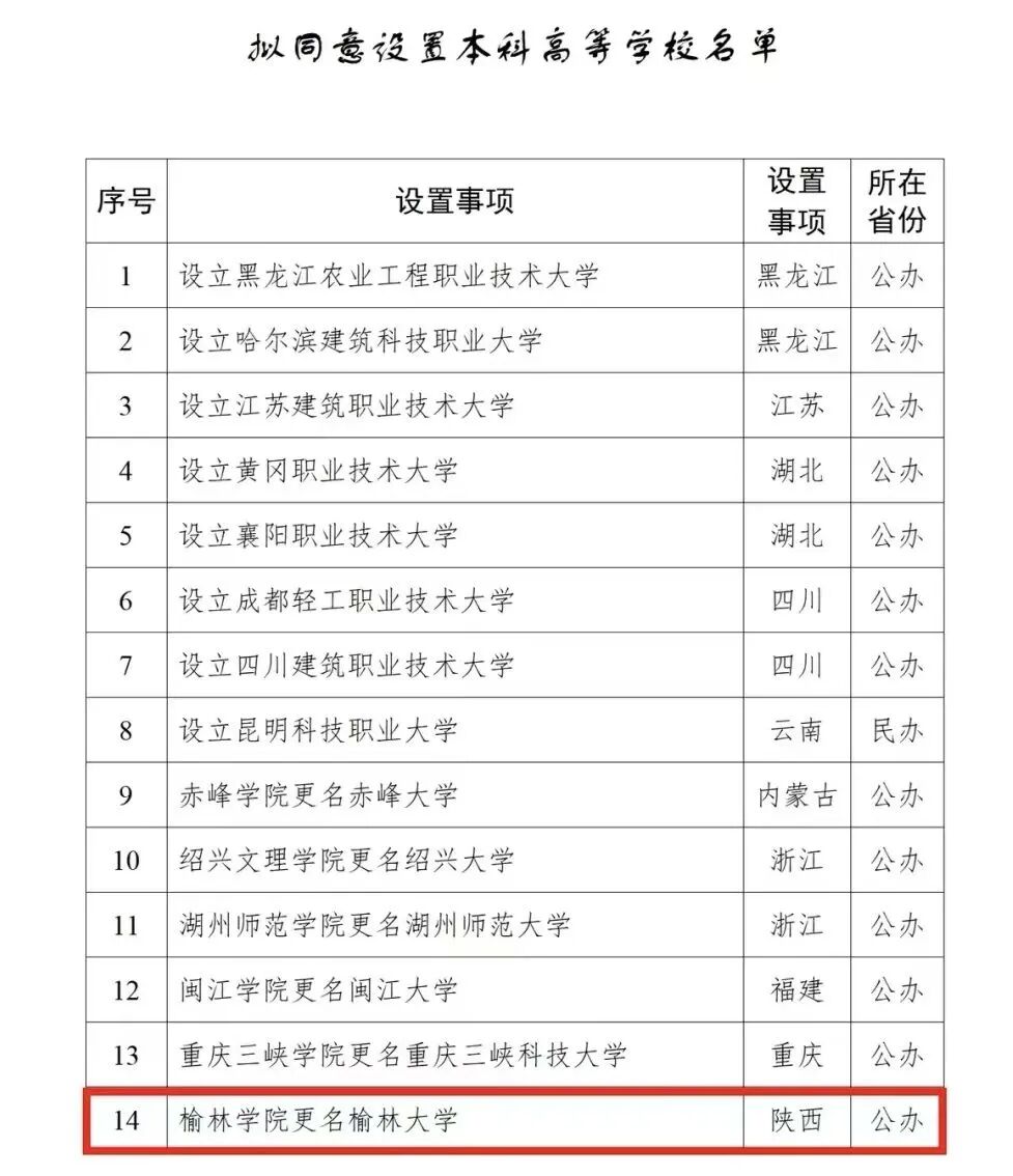 1月12日,教育部发布《关于拟同意设置本科高等学校的公示》,拟同意包括榆林学院更名为榆林大学在内的14所学校设置。