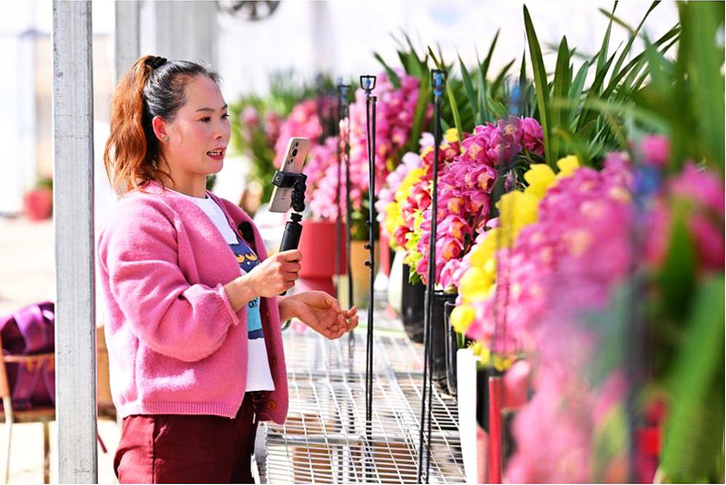 1月15日,在位于福建省宁德市周宁县七步镇的鸿腾农业开发有限公司花卉大棚内,工作人员在电商直播大花惠兰盆栽。